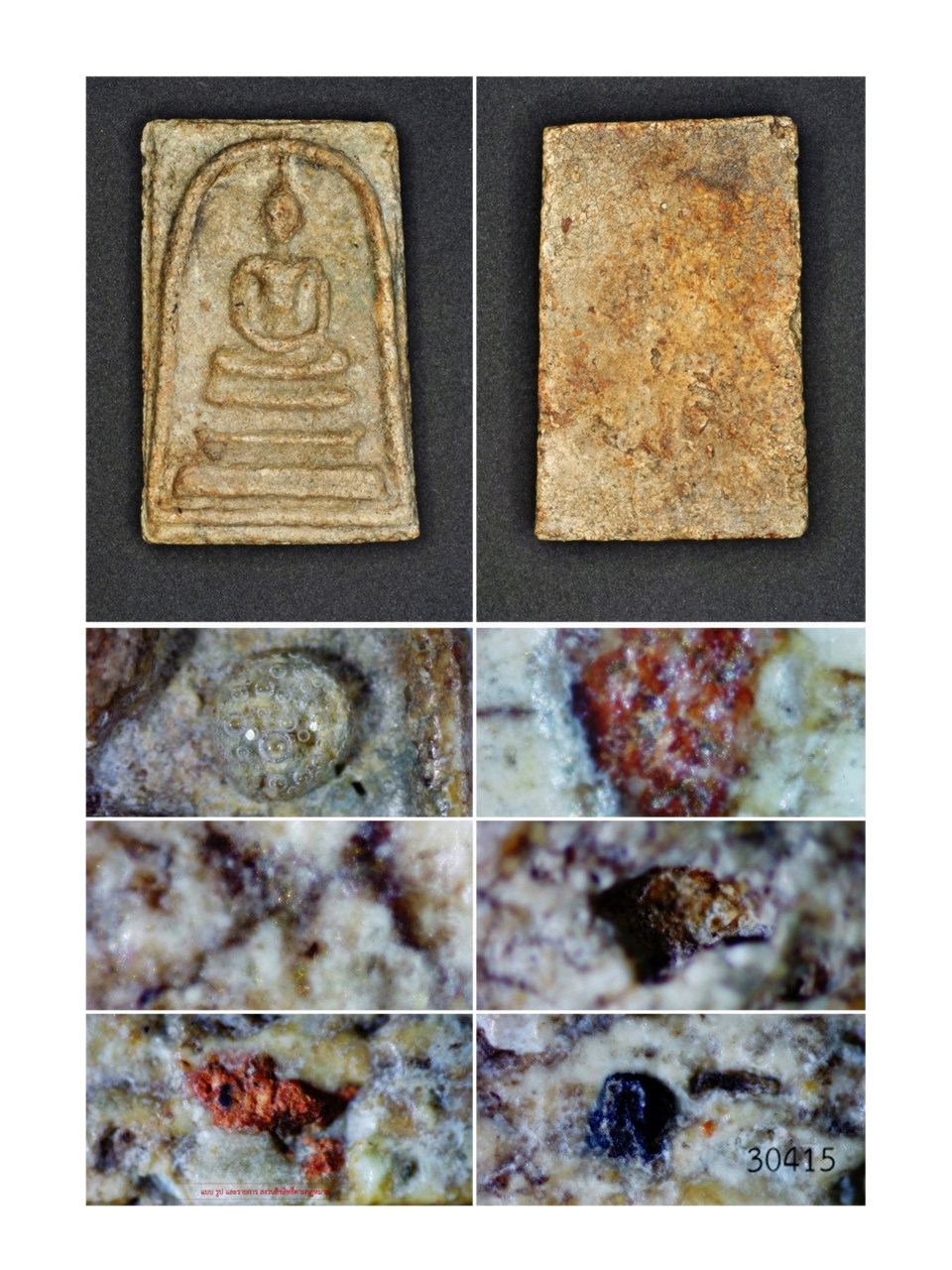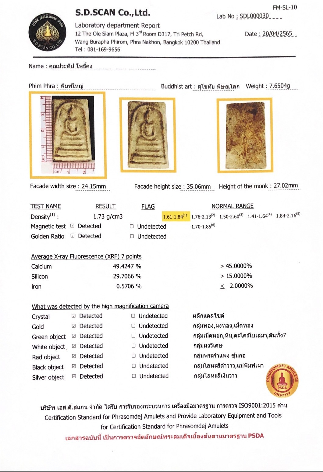 พระสมเด็จองค์นี้มีรูปลักษณ์ พุทธศิลป์ สุโขทัย พิษณุโลก ซึ่งเป็นพุทธศิลป์มีเกศทะลุซุ้ม มีรูปลักษณ์คล้ายกับพระพุทธชินราช จังหวัดพิษณุโลก การตรวจสอบเบื้องต้นด้วยตนเองโดยใช้สารเคมี HCL หยดบนเนื้อพระปรากฏว่ามีฟองขนาดใหญ่ จำนวนมาก และการตรวจสอบ ด้วยกล้องขยายกำลังสูง พบมวลสารการสร้าง ตามที่กล่าวไว้ในหนังสือเกี่ยวกับ การสร้างพระสมเด็จ จำนวนมาก รวมทั้งเม็ดทอง ผงทองด้านหลังองค์พระสวยงามมาก ในเนื้อองค์พระมีการเปลี่ยนแปลงเหี่ยว แห้ง ยุบ แยก ย่น และการงอกใหม่ ของแคลไซต์ ทั่วองค์พระมีสภาพความเก่าชัดเจน ผลการตรวจสอบเบื้องต้นนี้ สอดคล้องกับการตรวจสอบของ SD Scan ผลการตรวจสอบเบื้องต้น และผลการตรวจสอบตามมาตรฐาน ISO ของ SD Scan ทำให้เกิดความเชื่อมั่นและมั่นใจได้ว่าเป็นพระแท้ ที่มีพุทธคุณควรแก่การเช่าบูชาไว้ครอบครอง เพื่อเป็นสิริมงคล แก่ตนเองและครอบครัว